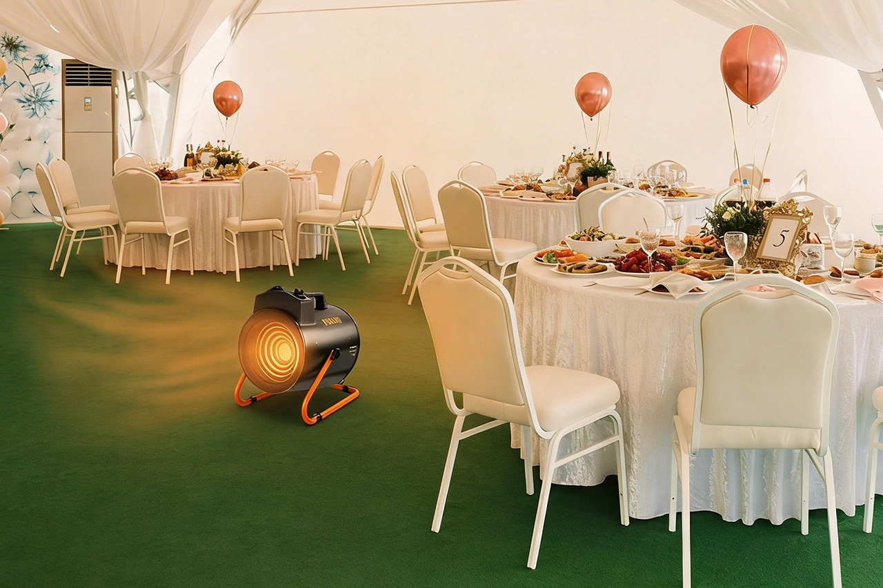 - Eventos en espacios temporales: donde resultan perfectos para calentar con rapidez carpas, pabellones feriales, estands comerciales o estructuras modulares donde no existe una infraestructura de climatización fija pero se requiere confort térmico inmediato para acoger a los asistentes o expositores presentes en estos espacios semiabiertos.
